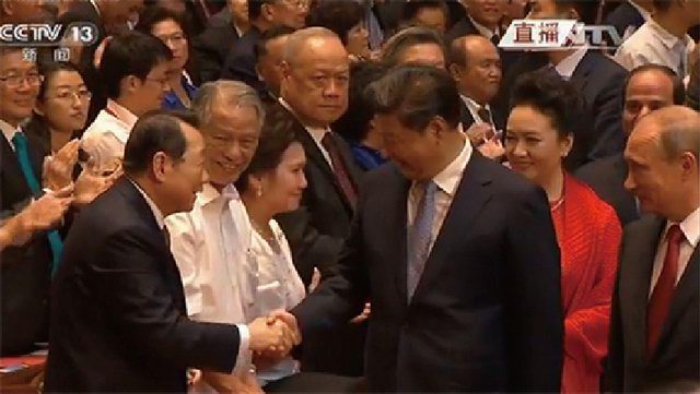 《胜利与和平》文艺晚会现场,习近平主席和谢国民董事长亲切握手